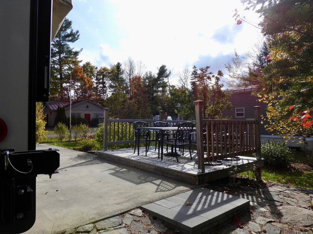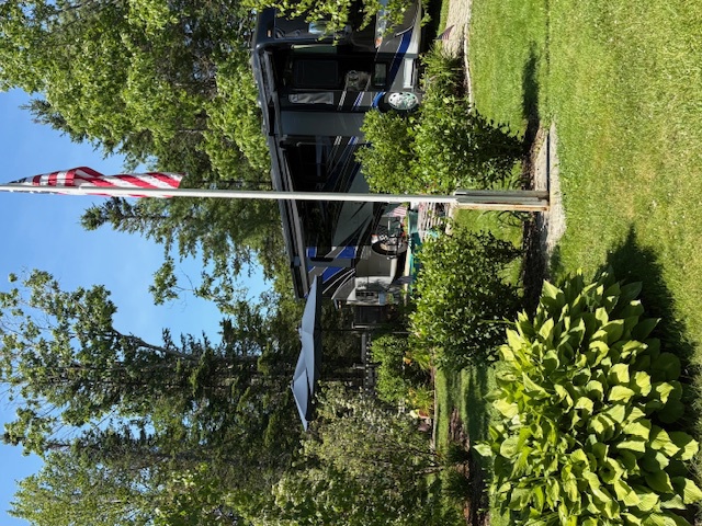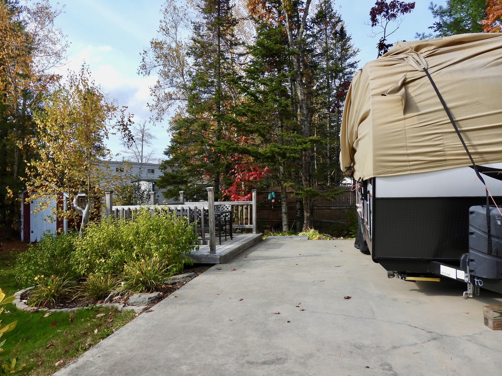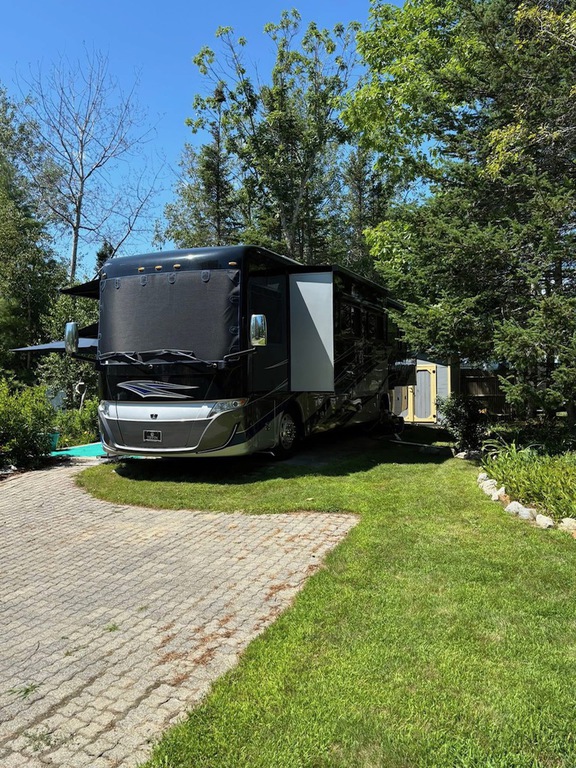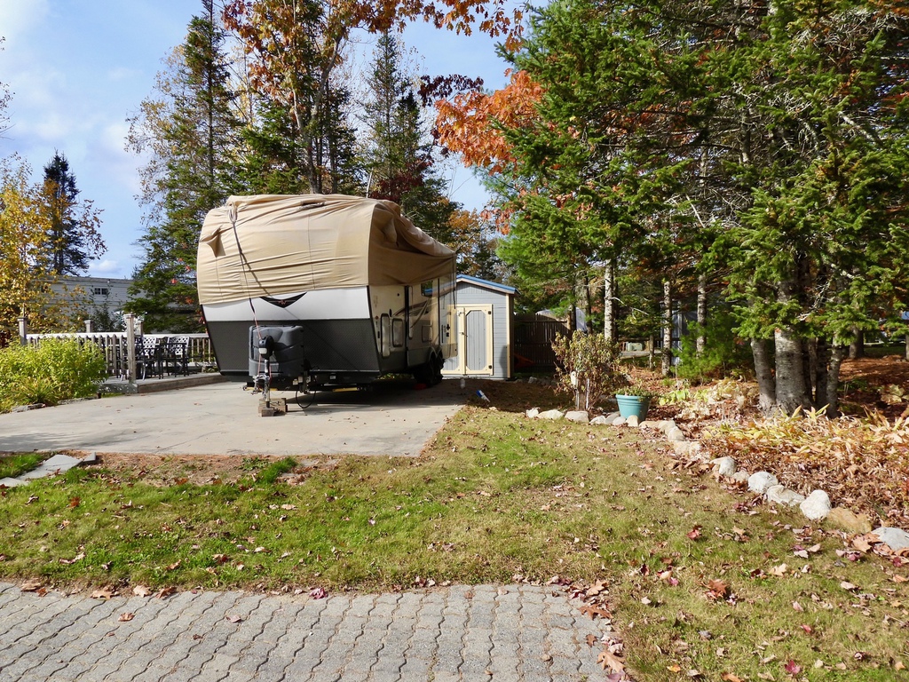 This level site features a concrete pad, paver driveway, deck, shed and a wide grassy area. It is equipped with 30/50 amp electric, water and sewer. It is convenient to the clubhouse and amenities as well as washroom and laundry facilities.