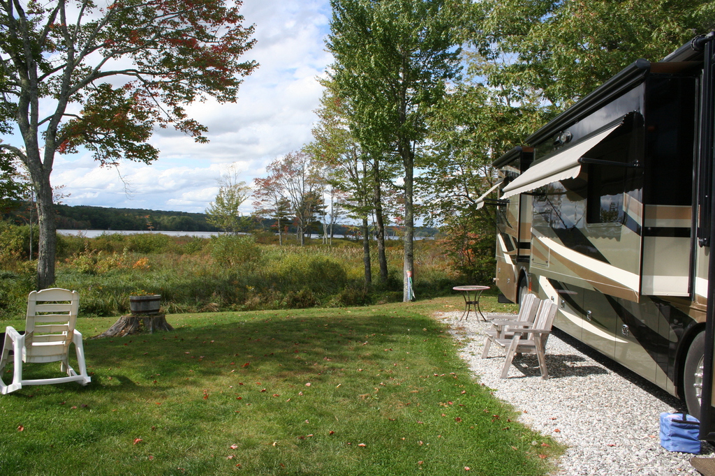This large and level gravel RV site has a wide view of South Pond and the common area. It is big rig friendly and has plenty of room for your car. The lot has both 50 and 30 amp electric, sewer, water and a fire ring. Many resort amenities include a boat ramp and new aluminum dock for small boats, a club house which opens onto the deck of a saltwater pool, two bath houses and a coin operated laundry. Located in the heart of Mid Coast Maine, close to beaches, shopping, festivals and attractions, this site always rents quickly.